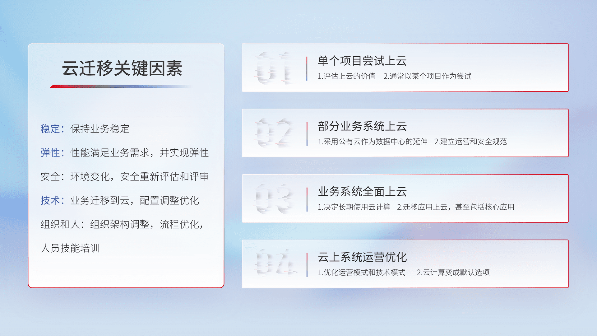 结合实际业务,,,,从规划设计、、云平台选型、、云原生改造、、、数据迁移、、集成交付,,,,迁移全过程为客户识别最佳上云路径,,,,做好风险识别管理,,设计网络架构、、、身份权限、、、、安全审计合规、、、操作审计、、、、日志审计、、监控告警策略、、、、多站点容灾设计等,,对云上基础设施进行整体规划,,,提升IT治理水平,,,以满足弹性、、、高可用、、、、高性能的需求。。。。